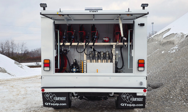 Ford F600 4x4 with 11' TORKT® Mini Lube Body. (2) 135-Gallon Product System. (2) 75-Gallon Product Systems. (1) 250-Gallon Steel Salvage System. 120# Grease System. Boss BA440 Air Compressor, American Eagle Toolbox.