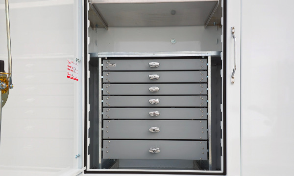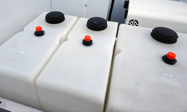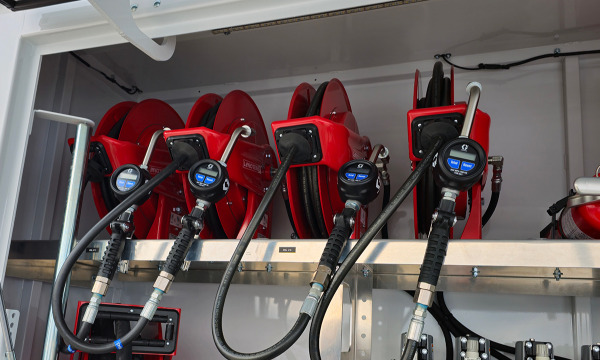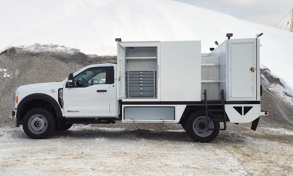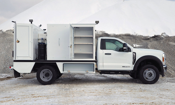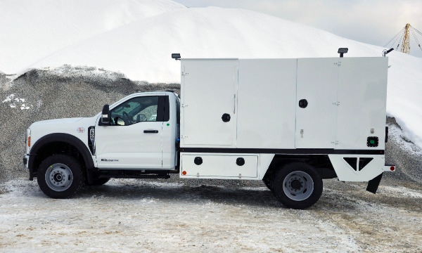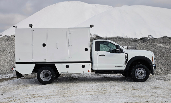 Ford F600 4x4 with 11' TORKT® Mini Lube Body. (2) 135-Gallon Product System. (2) 75-Gallon Product Systems. (1) 250-Gallon Steel Salvage System. 120# Grease System. Boss BA440 Air Compressor, American Eagle Toolbox.