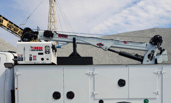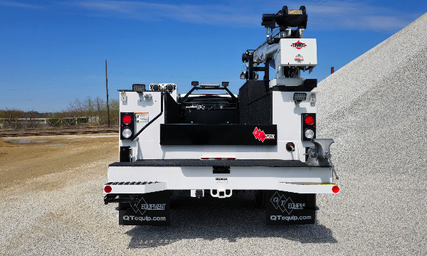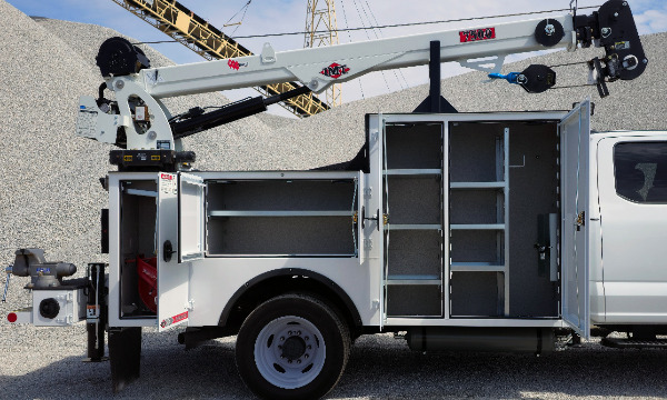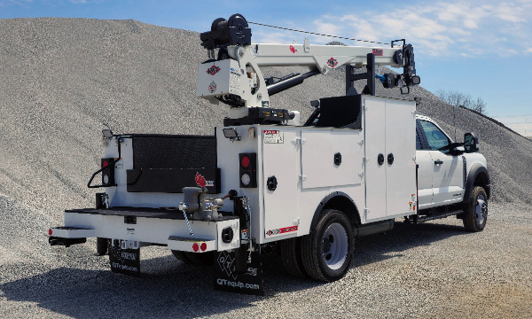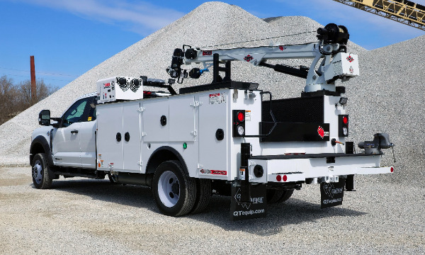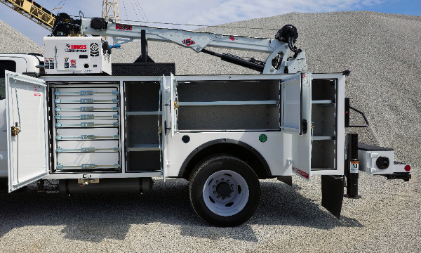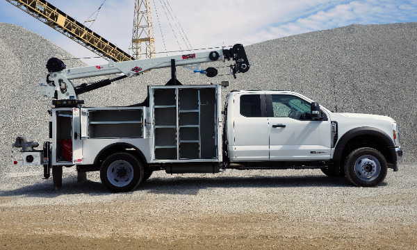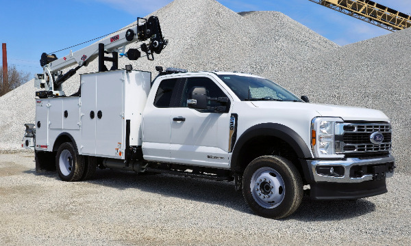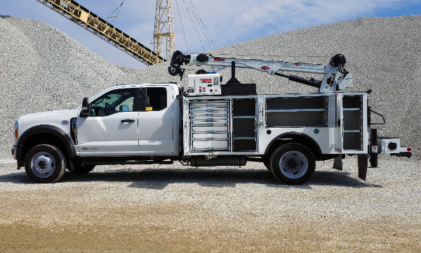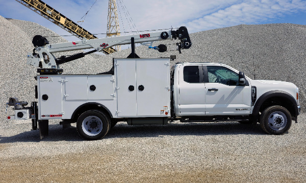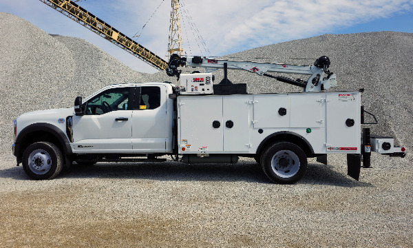Ford F550 extended cab service truck. 11' Dominator I service body. IMT 7500 telescopic crane. BA440 air compressor. AE toolbox in LV1. Similar unit pictured.