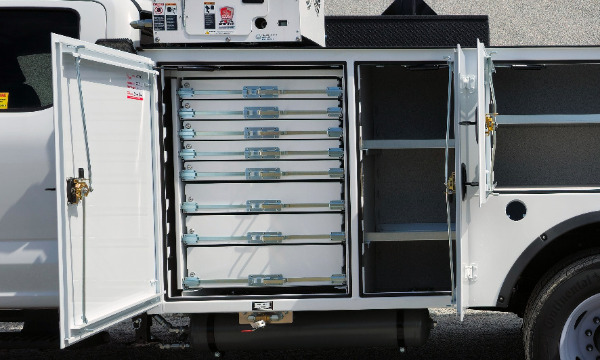 AE toolbox in LV1. Standard shelving in LV2, LH, LR, RH. 18-Drawer Bolt bin in RV2. Headache rack. LED work lights & strobe. Headache Rack. Wilton 8" Vise.