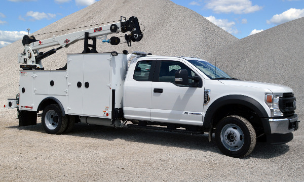 Ford F550 extended cab service truck. 11' Dominator I service body. IMT 7500 telescopic crane. BA440 air compressor. AE toolbox in LV1. Similar unit pictured.